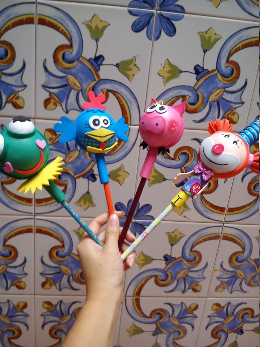 Aquí os traigo a unos divertidisimos y simpáticos fofulápices, tres de animales y uno de payaso, explicare por encima cada uno ya que los animales son prácticamente igual la forma en la que esta echo, y la diferencia de estos con el payaso es la ropa, y el sombrero y quizás el pelo. Bien, se coge una tira de goma eva, en el caso de la rana verde, el pajarito azul etc, de 6x3 y se ajusta al lápiz luego, se forra una bola de corcho de tal color, y se pega a la tira ya pegada y ajustada al la tira de goma eva, luego en el caso de la rana cogemos una bola más pequeña que la cabeza de corcho y la forramos de goma eva blanca y le pintamos pupilas y luego la pegamos a la cabeza a modo de ojos, forrando la parte inferior del ojo para que no queden desperfectos, luego la sonrisa y dos corazoncitos de goma eva rosa a cada lado de la sonrisa, y lo que lleva en el cuello. El cerdo, entero de goma eva rosa, con unas orejitas de pico, y un hocico pegado a parte, y cuatro pezuñas negras que le cuelgan de la parte de abajo. El pajaro entero de azul, pero con una especie de cresta roja en la parte superior, dos alas a cada costado, y pico, patas y ojos pintados y pegados aparte. Pasamos al payasete la ropa que lleva es de goma eva lila pegada encima de la primera capa que acaban en unos pantalones, y el pelo son tiras de goma eva pegadas dobladas y recortadas.